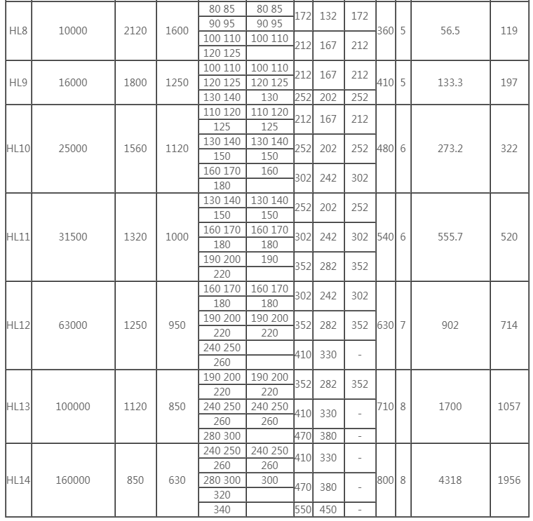 本HL型彈性柱銷聯(lián)軸器已列為 標(biāo)準(zhǔn)GB5014-85,適用于各種機(jī)械聯(lián)接兩同軸線的傳動(dòng)軸,通常用于動(dòng)頻繁的高低速運(yùn)動(dòng)。工作溫度為-20 ~+80℃;傳遞公稱扭矩為40~20000N.m。