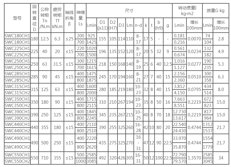 SWC-CH型單伸縮焊接式聯(lián)軸器 SWC-CH型單伸縮焊接式聯(lián)軸器是一種常用的聯(lián)軸器。利用其結(jié)構(gòu)的特點(diǎn)能使不在同一軸線或軸線折角較大或軸向移動(dòng)較大的兩軸等角速連續(xù)回轉(zhuǎn),并可靠地傳遞轉(zhuǎn)矩和運(yùn)動(dòng)。 SWC-CH型單伸縮焊接式聯(lián)軸器能廣泛應(yīng)用于冶金、起重、工程運(yùn)輸、礦山、石油、船舶、煤炭、橡膠、造紙機(jī)械及其它重機(jī)行業(yè)的機(jī)械軸系中傳遞轉(zhuǎn)矩。 SWC-CH型單伸縮焊接式聯(lián)軸器基本參數(shù)與主要尺寸: